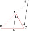 Und da AD die Winkelhalbierende ist, sind auch die Winkel BAD und CAD gleich. Somit sind auch die Winkel ACE und ACE gleich, was bedeutet, das Dreieck ist gleichschenklig und damit AC = AE. Und weil AD parallel zu EC (die einen Seite im Dreieck BCE) ist, ist das Verhältnis der Seiten DB : DC gleich dem Verhältnis AB : AE. Da aber das Dreieck ACE gleichschenklig ist, ist AC = AE (s.o.), somit ist DB : DC = AB : AC. |