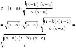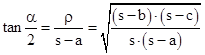 Der Tangens des halben Winkels α kann im Teildreieck und im ganzen berechnet werden: die Formel wird nach ρ aufgelöst, und der vor der Wurzel stehende Faktor unter die Wurzel gebracht: